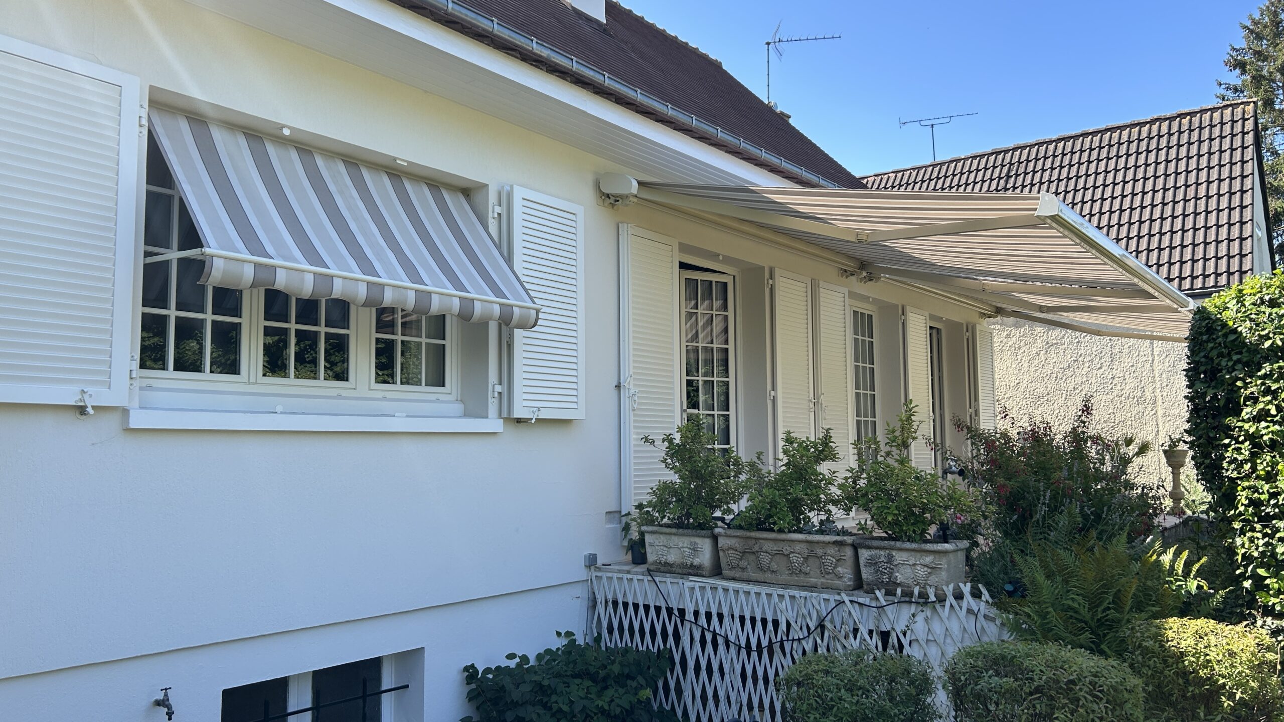 Store Banne de la marque MATEST modèle KITANGUY avec coffre Ral 1015, toile Dickson Orchestra 290gr, motorisation SOMFY io avec automatismes « fermeture vent » Eolis 3D